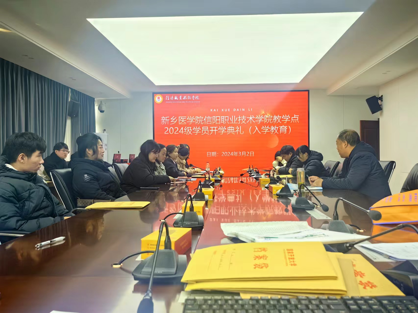 3月2日,新乡医学院信阳教学点2024级学员开学典礼在信阳职业技术学院学管楼二楼大会议室隆重进行,来自豫南地区(信阳、驻马店)50余名学员参加开学典礼。学院院长柯楠出席开学典礼并讲话。